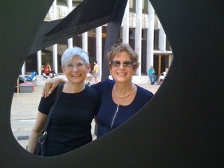 Jane and Barbara behind Calder sculpture in Lincoln Center